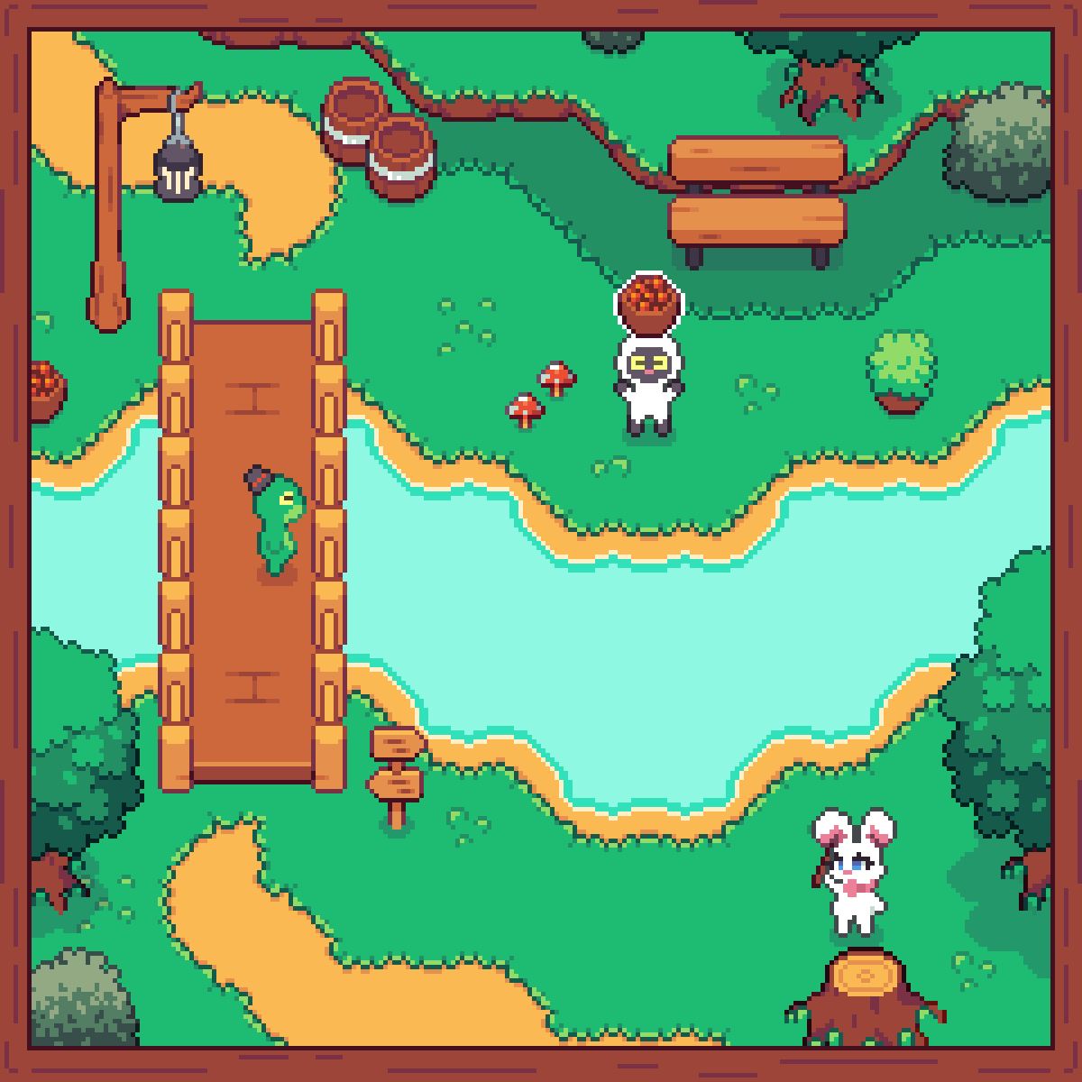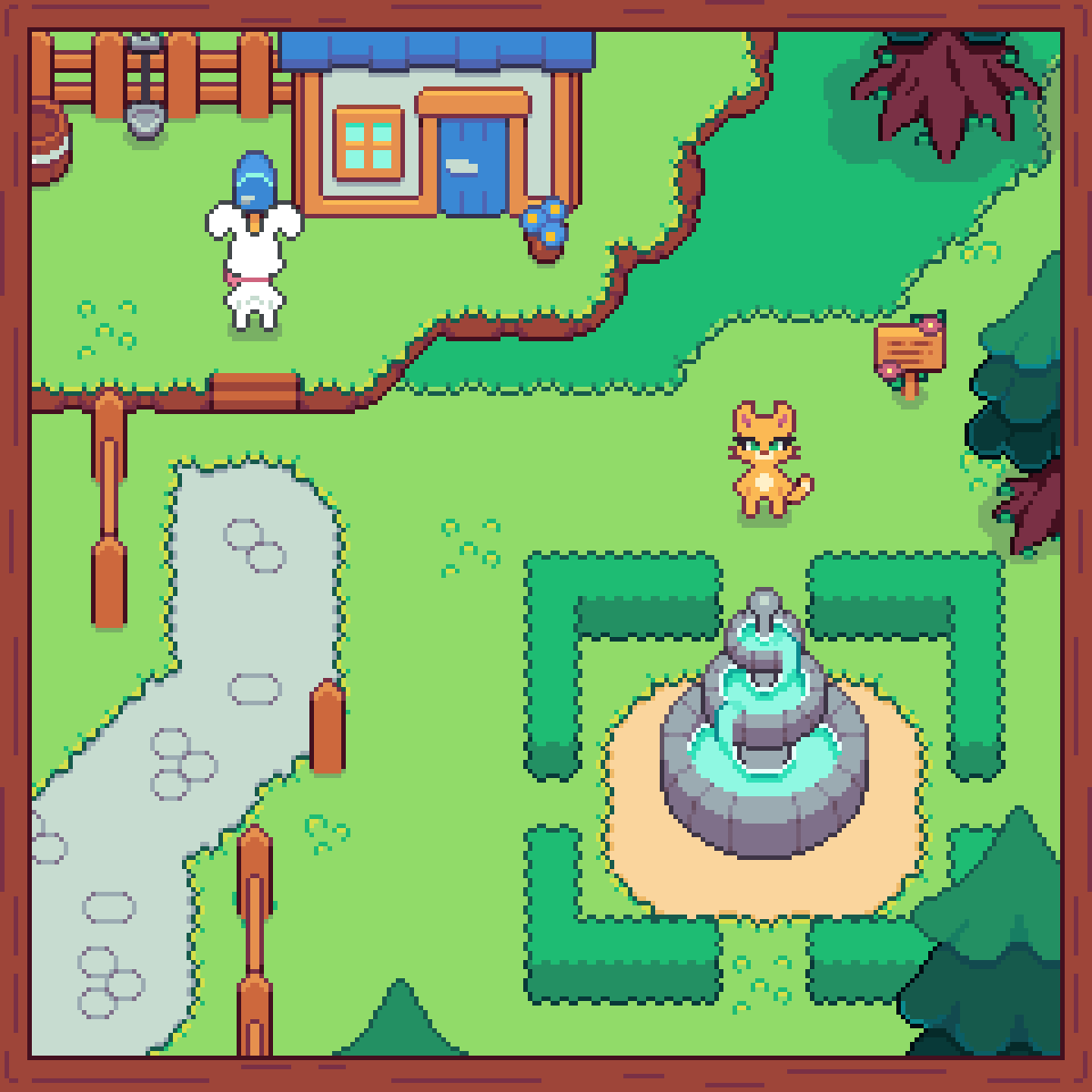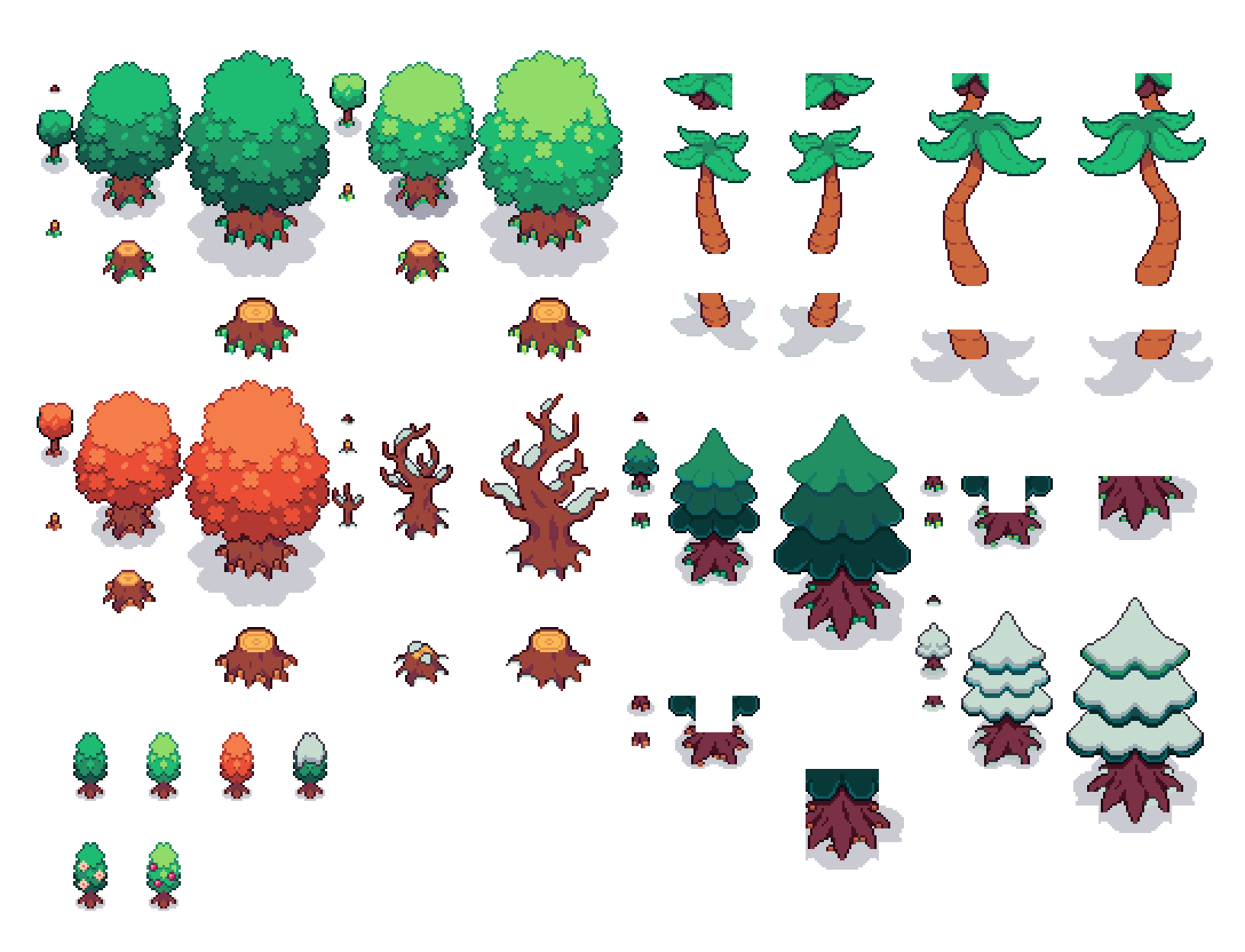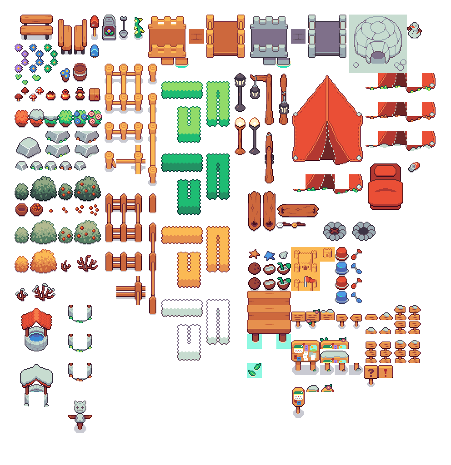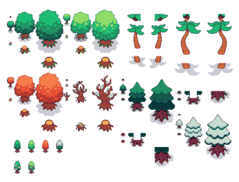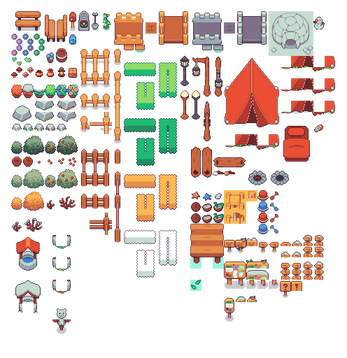 It is a 16x16 pixel exterior tilesets. This asset pack always stays be free. This asset pack is part of the Cozyland asset series. Includes 2400+ tiles, trees, 4 season tilesets (grass, tree and other stuff), beach tiles, camp and more. The characters in photos are from Cozyland - Character sprites